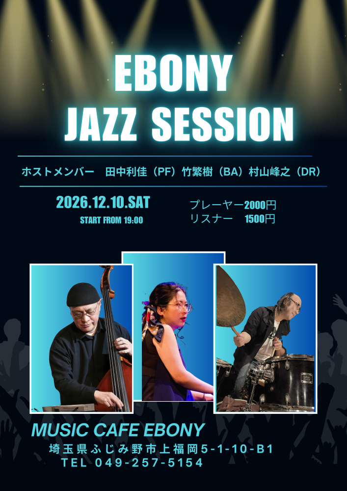 エボニージャズセッションホストメンバー田中利佳(pf)竹 繁樹 (ba)村山峰之(dr)プレーヤー2000円1D付リスナー 1500円1D付