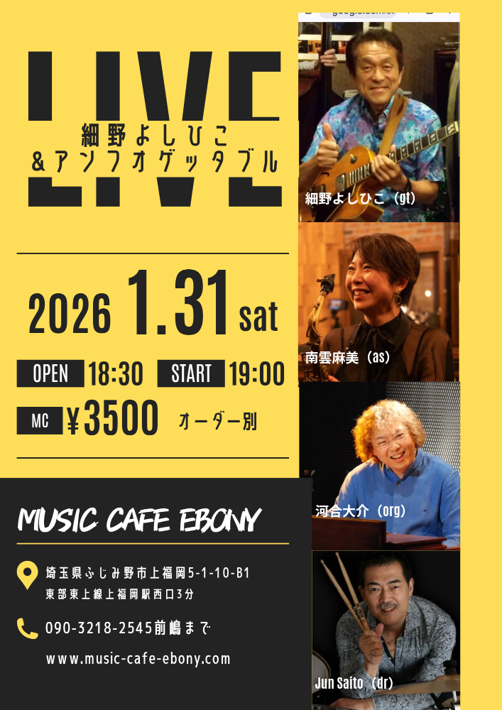 細野よしひこ&アンフオゲッタブル細野よしひこ(gt)南雲麻美(as)河合大介(org)Jun Saito(dr)MC3500円 オーダー別