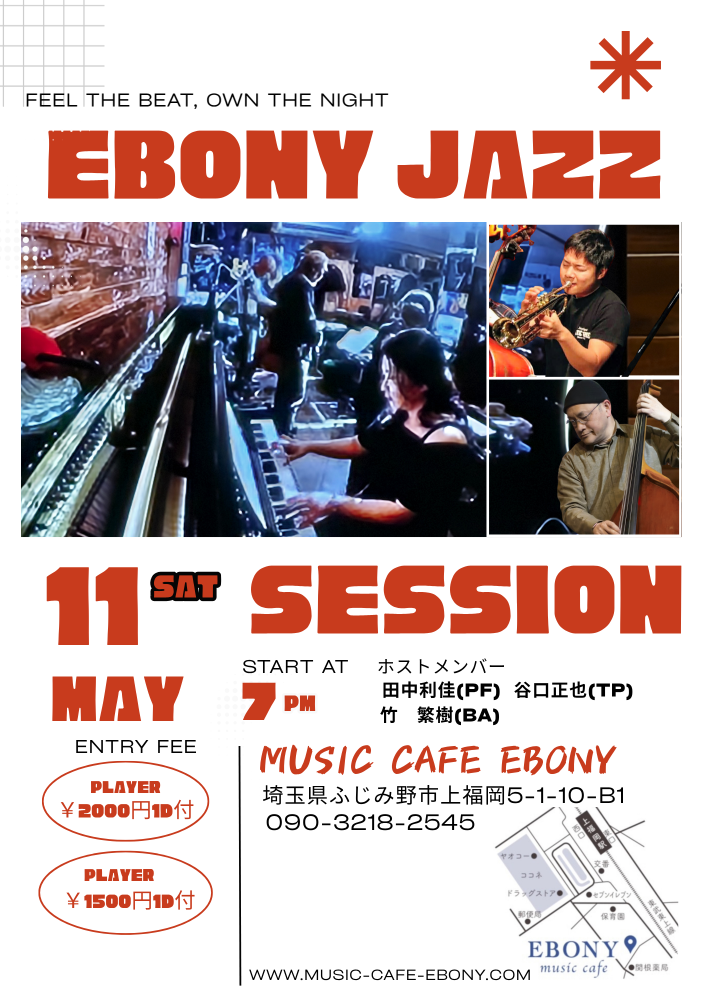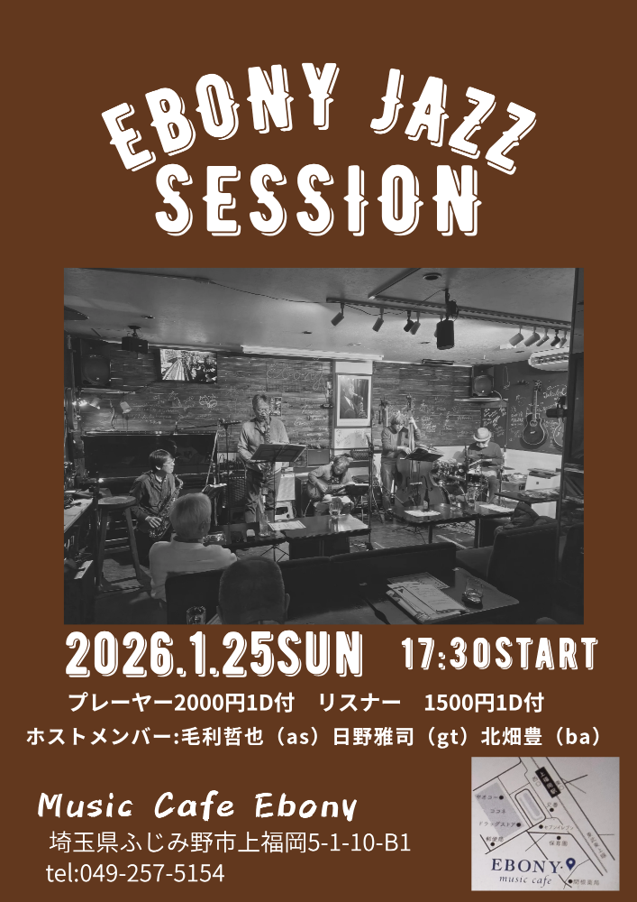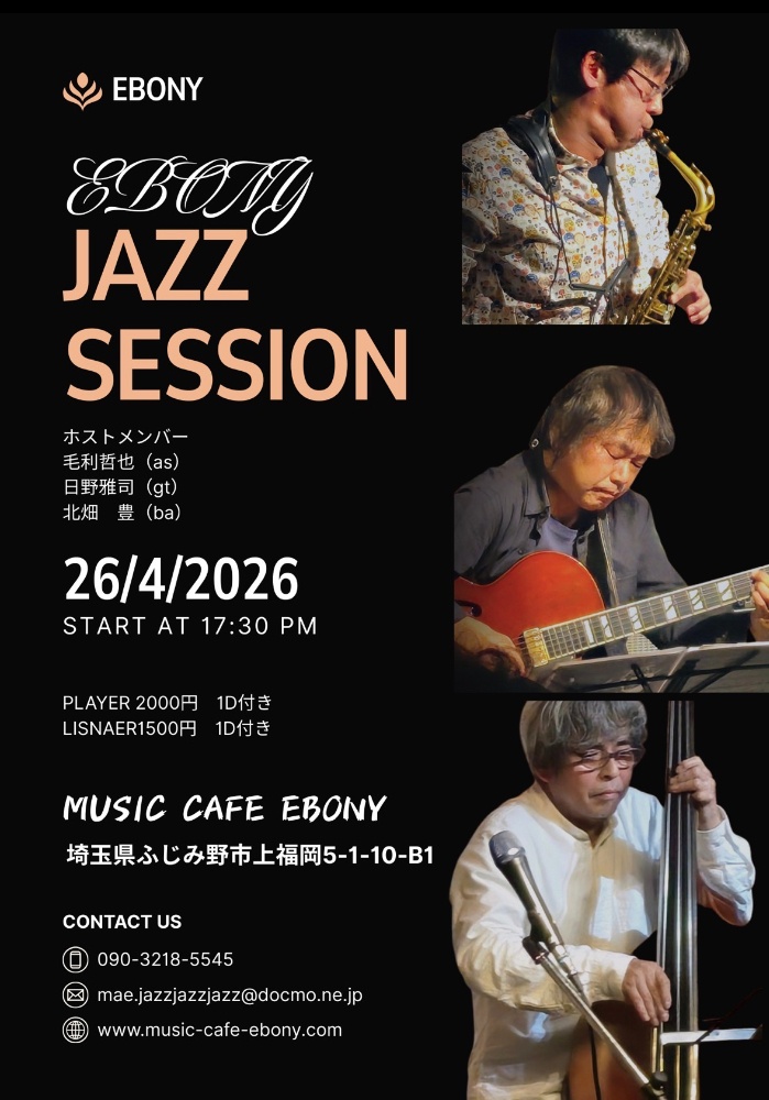 エボニージャズセッションホストメンバー毛利哲也(as)日野雅司(gt)北畑 豊(ba)プレーヤー2000円1D付きリスナー 1500円1D付き