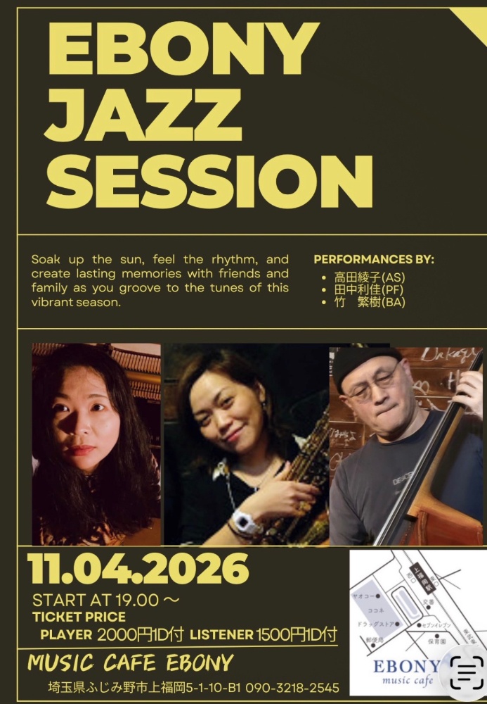 エボニージャズセッションホストメンバー田中利佳(pf)高田綾子(as)竹 繁樹(ba)プレイヤー2000円リスナー 1500円