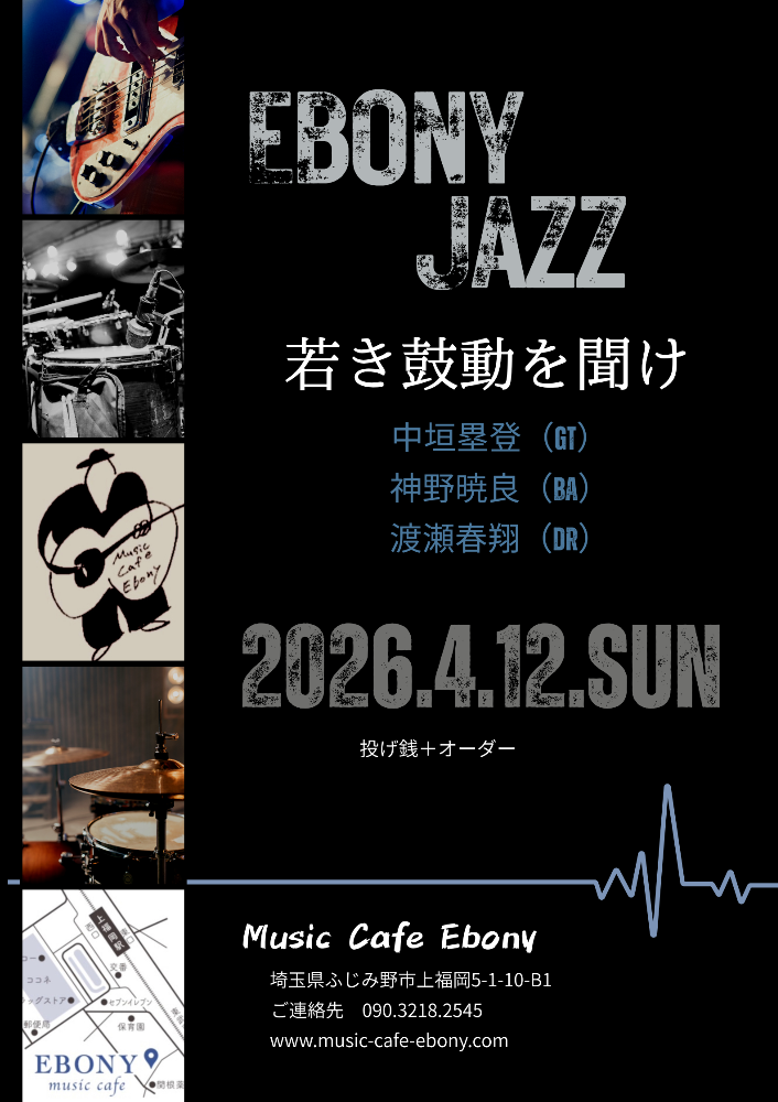 エボニージャズライブ若手トリオ中垣 塁登(なかがきるいと)gt神野 暁良(じんのあきら)Ba渡瀬 春翔(わたせはると)dr投げ銭でお願い致します。飲食オーダー別
