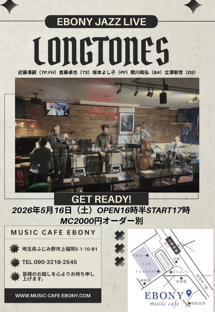 エボニージャズライブロングトーンズ近藤清嗣(tp.fp.)首藤卓也(ts)坂本よし子(pf)関川弘和(ba)立澤郁世(ds)MC2000円飲食オーダー別