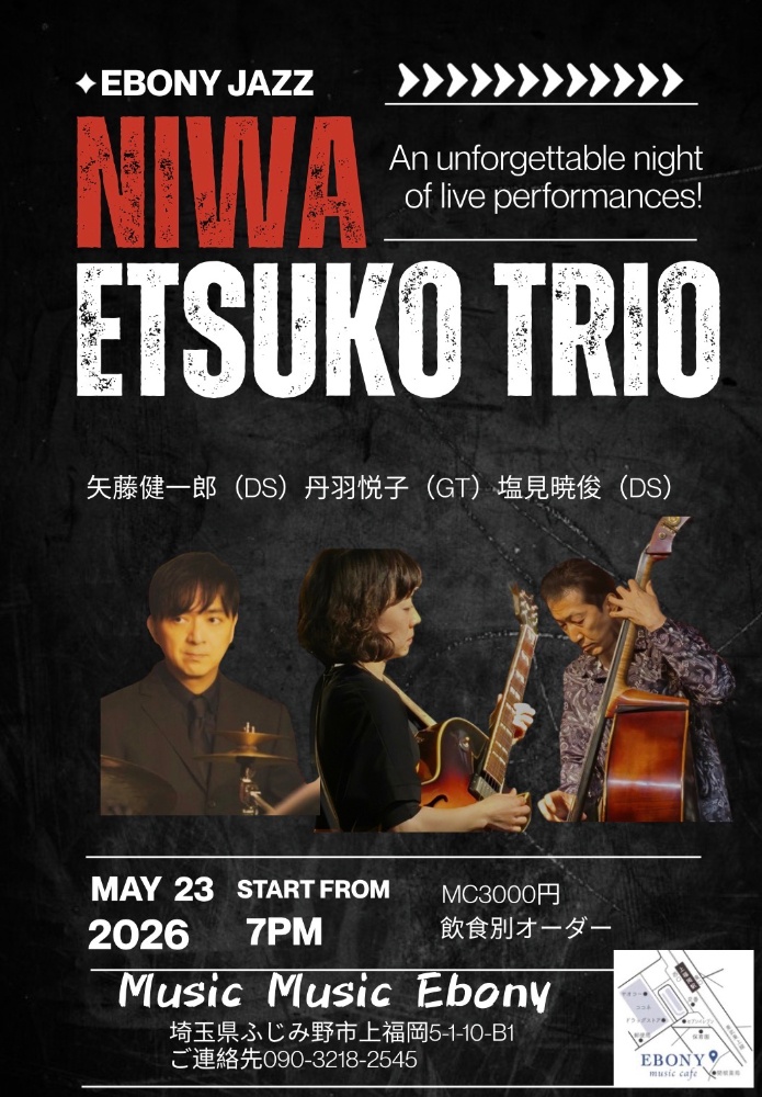エボニージャズライブ丹羽悦子トリオ丹羽悦子(gt)塩見暁俊(ba)矢藤健一郎(ds)MC3000円飲食オーダー別