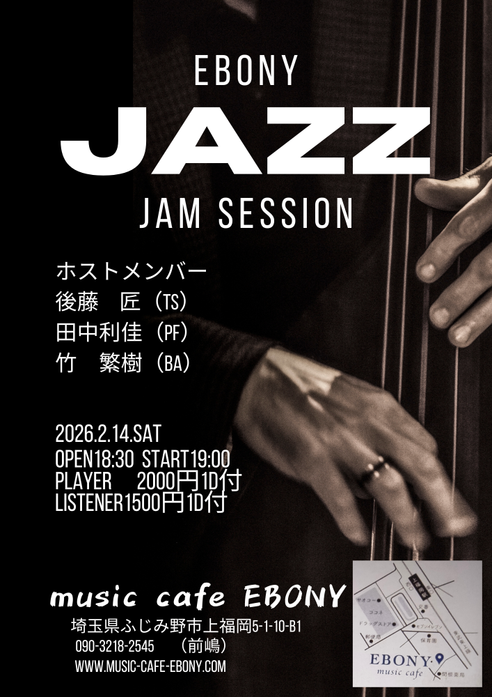 エボニージャズセッションホストメンバー後藤 匠(as)田中利佳(pf)竹 繁樹(ba)player 2000円1D付listener1500円1D付