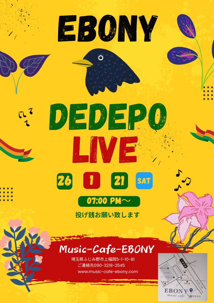 エボニーライブDEDEPO ゆみこ(pf)くま(ba)のぶ(gt.三線.デイジリド)Zukky(dr)オープン18時半スタート19時投げ銭でお願い致します。飲食別オーダー