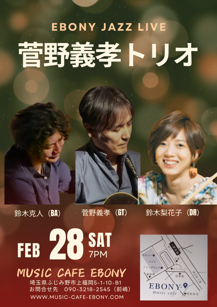 エホニージャズライブ菅野義孝トリオ菅野義孝(gt)鈴木克人(ba)鈴木梨花子(dr)MC3000円飲食別オーダー