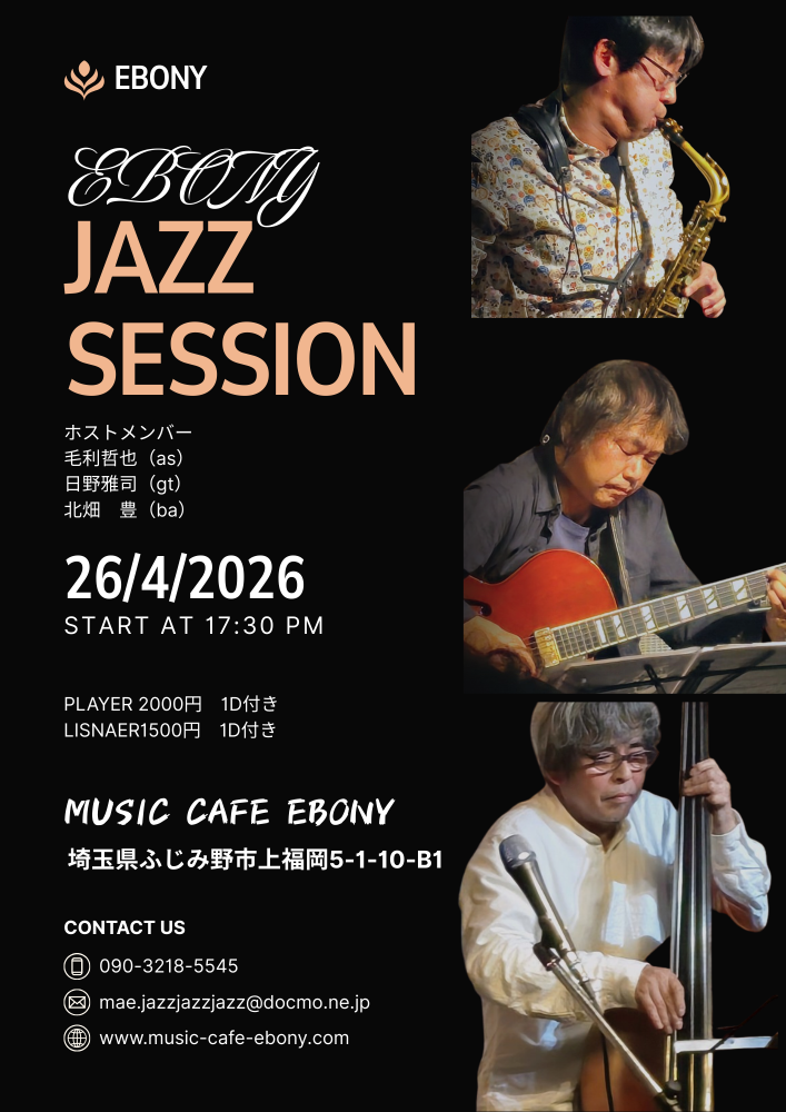 エボニージャズセッションホストメンバー毛利哲也(as)日野雅司(gt)北畑 豊(ba)プレーヤー2000円1D付きリスナー 1500円1D付き